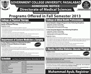 Government College University Faisalabad Admission Notice 2013 Government College University Faisalabad GCU Admission Notice 2013 for Doctor of Physical Therapy (DPT) , Bachelor of Eastern Medicine & Surgery (BEMS) , B.Sc. (Hons) Operation Theatre Technology , B.Sc. (Hons) Medical Laboratory Technology , B.Sc. (Hons) Radiography and Imaging Technology and Diabetes Education Program.