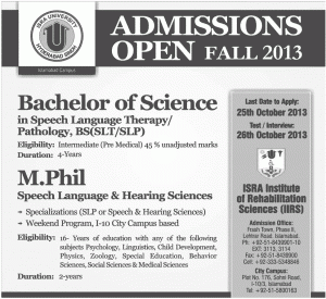 ISRA Institute of Rehabilitation Sciences Islamabad Admission Notice 2013 ISRA Institute of Rehabilitation Sciences Islamabad Admission Notice 2013 for BS Speech Language Therapy, BS Speech Language Patholog, M.Phil Speech and Hearing Sciences.